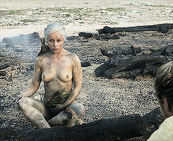 • Cuando nacen sus dragones, Daenerys aparece desnuda tras meterse en el fuego y no quemarse